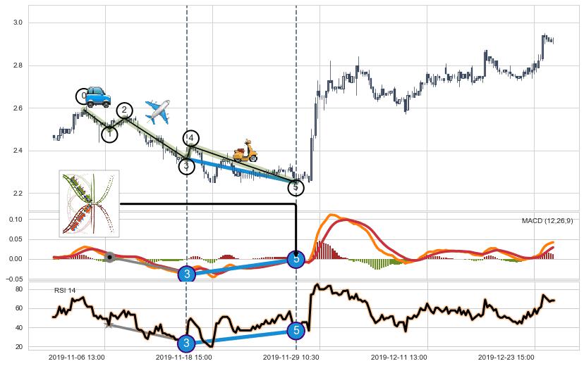 从2019-10-21 14:00至2019-11-14 15:00,共包含110个小时,阶段股价上涨0.26%,阶段股价变动位移路程比: 1 : 198
