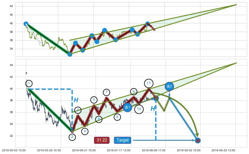 ➣ 升楔型:猜想临近关键支撑位突破点 → 临近拐点下跌 → 风险信号 → 大趋势均值回复
