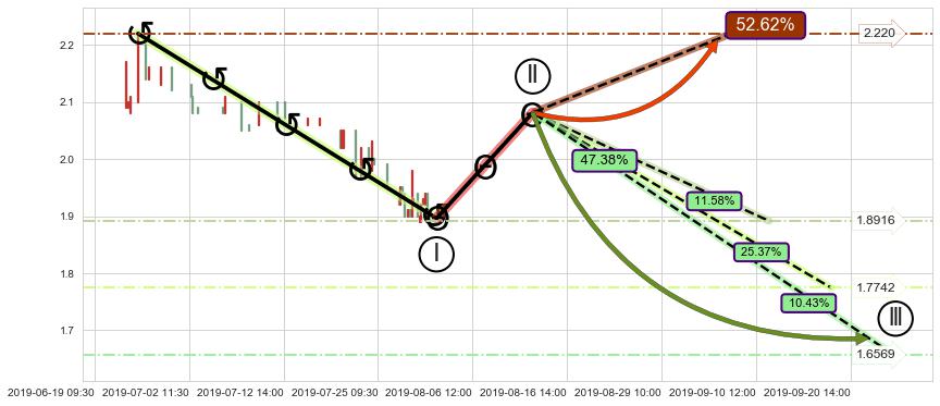 ♘ 阻力价格位2.100,可信任强度92.56%,距离最后交易2019-07-31 15:00形成的收盘价格1.9000相差 +10.53%