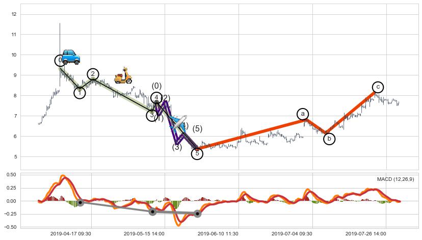 ➣ 波浪理论:猜想达到c点后小反弹终止反转下跌 → 下跌 → 【拐点】临近 → 阶段均值回复结束后继续大周期趋势跟踪