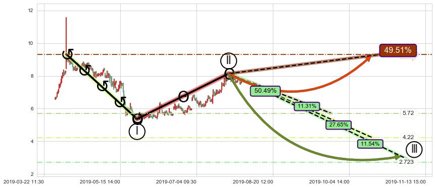 ➣ 调整浪已超过预测的c点位置,后续大趋势循环浪继续下跌概率50.49%,谨慎做多