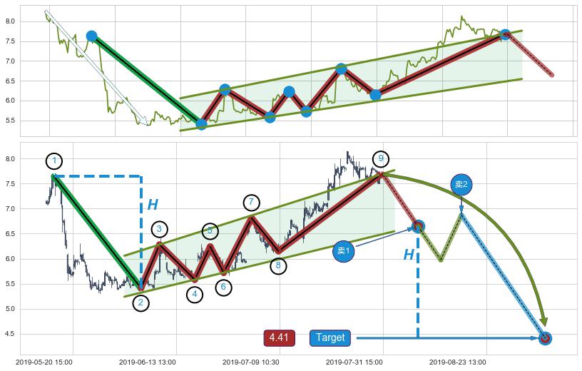 ➣ 升旗形:猜想临近关键支撑位突破点 → 临近拐点下跌 → 风险信号 → 大趋势均值回复