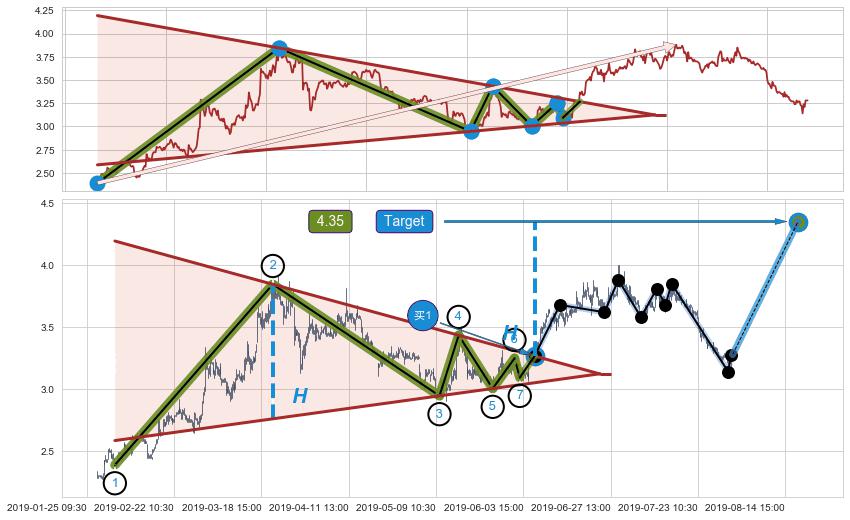 从2019-02-01 11:30至2019-07-08 10:30,共包含603个小时,阶段股价上涨46.86%,阶段股价变动位移路程比: 1 : 12,上涨趋势角度: 32.8