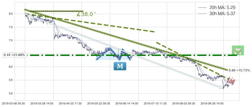 从2019-03-06 09:30至2019-08-29 14:00,共包含719个小时,阶段股价下跌-39.27%,阶段股价变动位移路程比: 1 : 7,下跌趋势角度: 38.0
