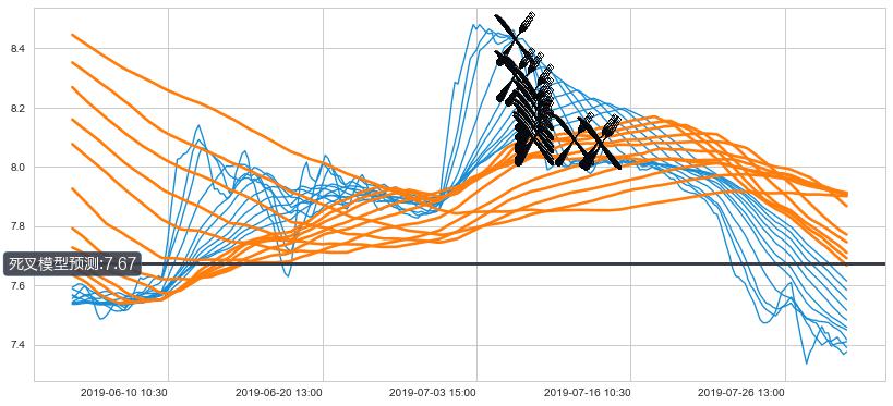 ➢ 70小时均线于(07-08 15:00: 8.10)形成【死叉】基于【死叉历史模型】预测死叉后最低波谷价格: 7.68, 死叉后最低价格7.32,已经下跌超出预测最低波谷价格, 预期反弹