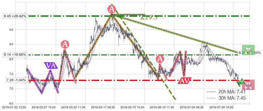♘ 支撑价格位7.28,可信任强度84.30%,距离最后交易2019-07-31 15:00形成的收盘价格7.36相差 -1.04%