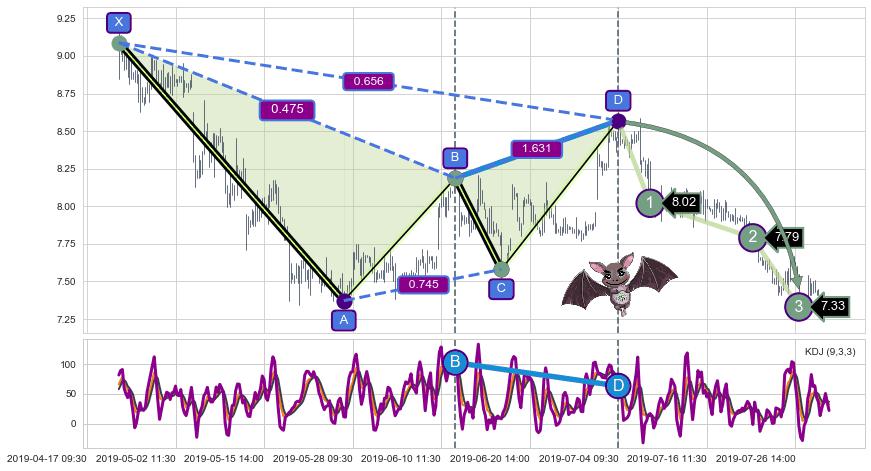 ➣ 谐波蝙蝠:d下跌已到达第❸目标:猜想支撑拉升 → 上涨 →【拐点】机会信号 → 大趋势均值回复