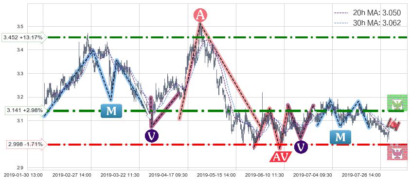♘ 阻力价格位3.141,可信任强度91.72%,距离最后交易2019-07-31 15:00形成的收盘价格3.050相差 +2.98%