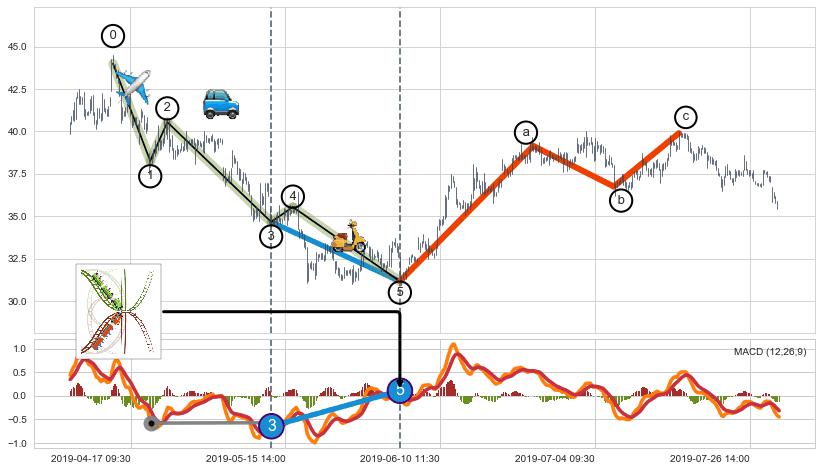➣ 波浪理论:猜想达到c点后小反弹终止反转下跌 → 下跌 → 【拐点】临近 → 阶段均值回复结束后继续大周期趋势跟踪