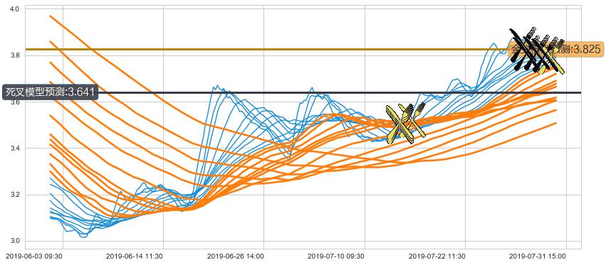 ➢ 34小时均线于(07-30 10:30: 3.808)形成【死叉】基于【死叉历史模型】预测死叉后最低波谷价格: 3.634, 死叉后最低价格3.760,尚未达到预测最低波谷价格, 预期继续下跌