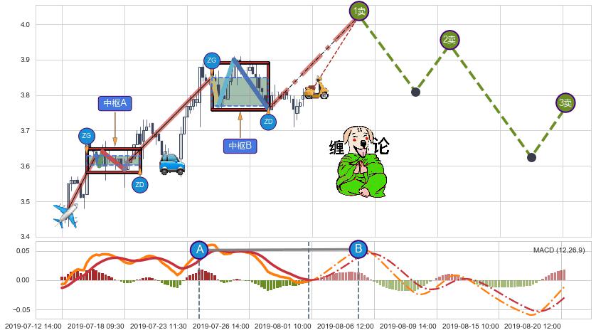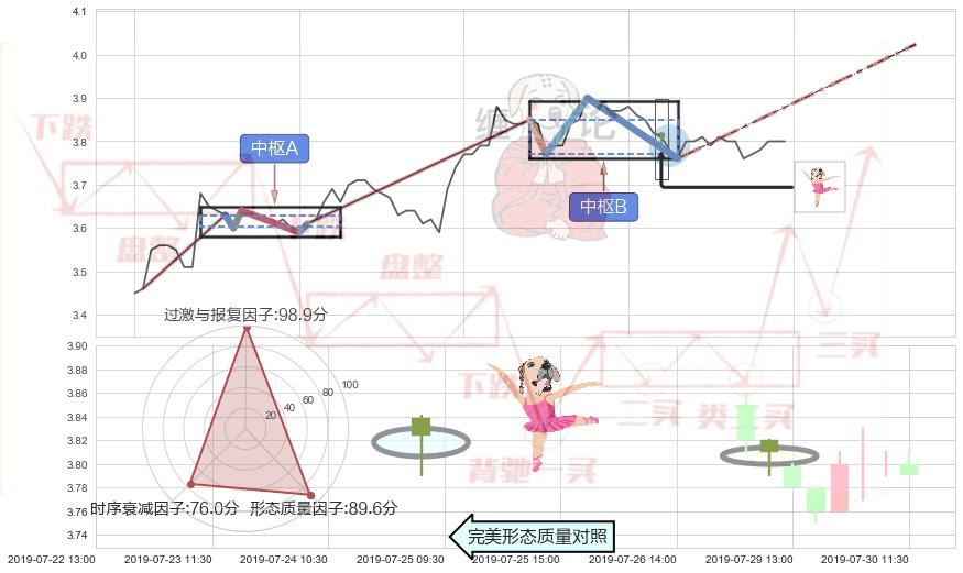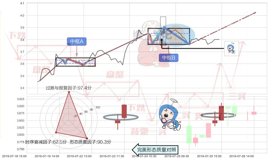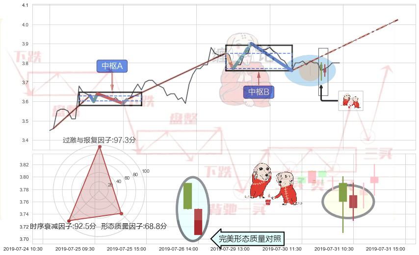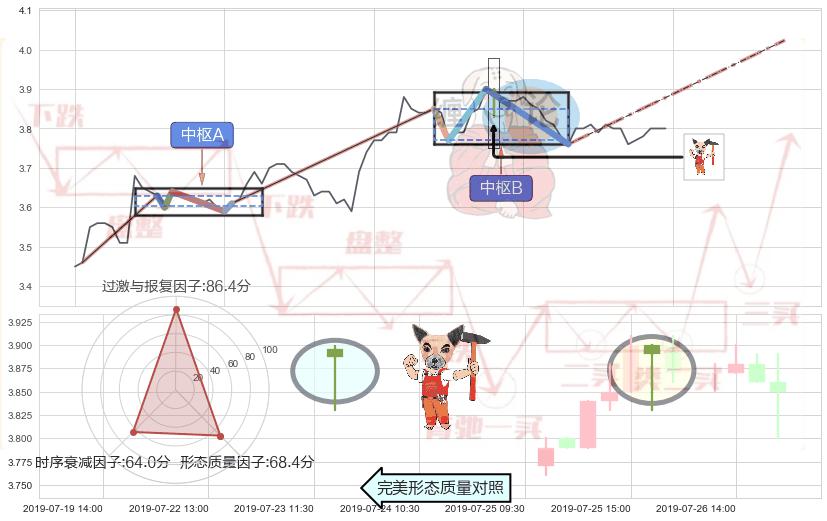 ➣ 【中枢B】:07-24:14-07-29:14,中枢由4笔构成,共19交易小时, ZG=3.850, ZD=3.770