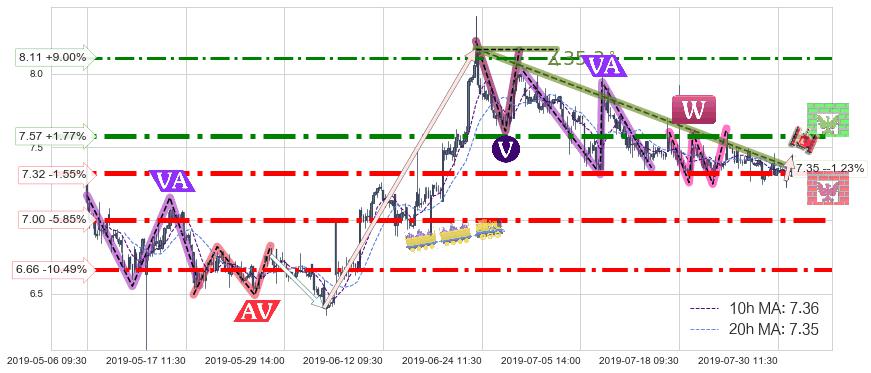 ♘ 阻力价格位7.57,可信任强度85.40%,距离最后交易2019-07-31 15:00形成的收盘价格7.44相差 +1.77%