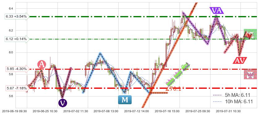 ♘ 阻力价格位6.12,可信任强度51.76%,距离最后交易2019-07-31 15:00形成的收盘价格6.11相差 +0.14%