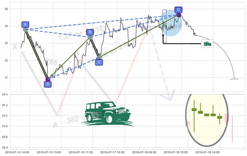 ➢ 谐波蝴蝶:c上拉到达d:猜想下沉 → 下跌 →【拐点】强阻力临近 → 大趋势均值回复