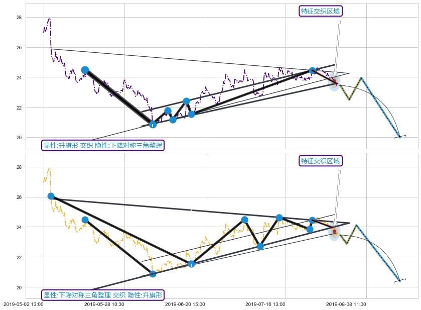 ➢ 下降对称三角整理:下行突破支撑位破位, 猜想持续下沉下跌,被突破的支撑位已变为阻力位