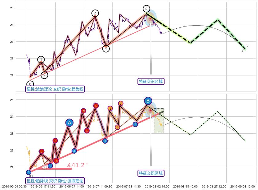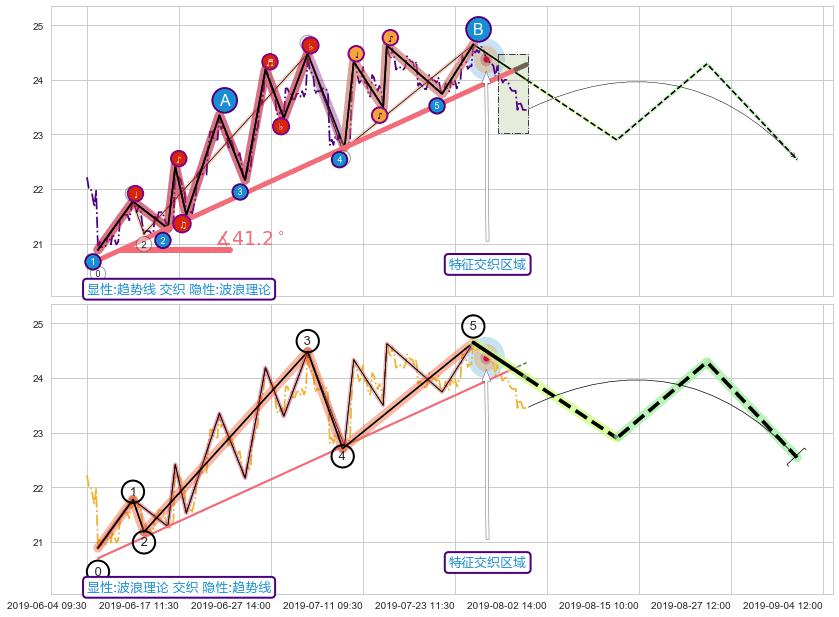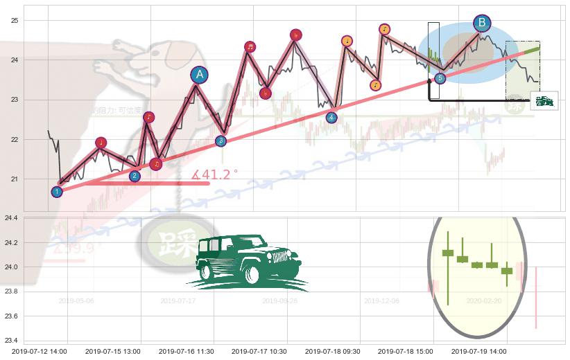 从2019-06-05 09:30至2019-07-30 15:00,共包含228个小时,阶段股价上涨13.99%,阶段股价变动位移路程比: 1 : 9,上涨趋势角度: 41.2