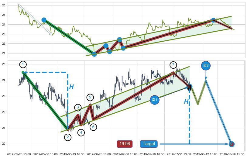 ➢ 最小中继整理跌幅→𝐇: 3.582 (低点逐步抬高斜边第一支撑点②与阻力边垂直距离)