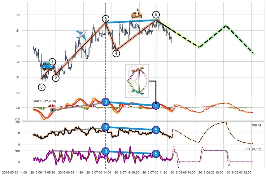 从2019-06-27 10:30至2019-07-15 10:30,共包含67个小时,阶段股价上涨2.22%,阶段股价变动位移路程比: 1 : 20