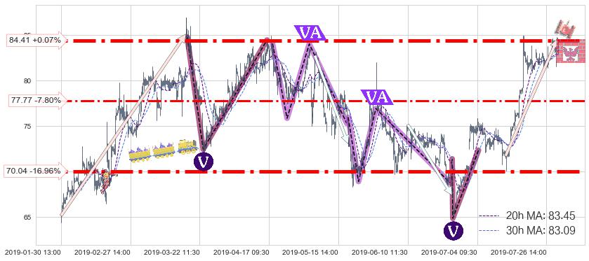 ♘ 支撑价格位70.04,可信任强度94.61%,距离最后交易2019-07-31 15:00形成的收盘价格84.35相差 -16.96%