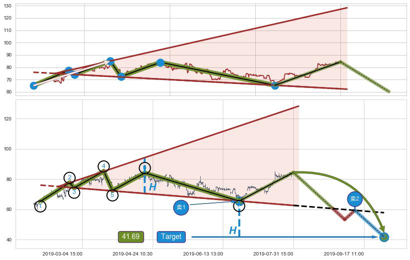 ➢ 扩散三角反转:猜想临近关键支撑位突破点 → 临近拐点下跌 → 风险信号 → 大趋势均值回复