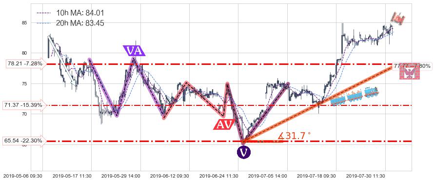 从2019-06-04 14:00至2019-06-20 13:00,共包含66个小时,阶段股价上涨5.40%,阶段股价变动位移路程比: 1 : 7
