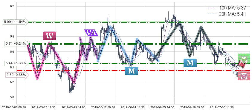 ♘ 阻力价格位5.99,可信任强度66.20%,距离最后交易2019-07-31 15:00形成的收盘价格5.37相差 +11.54%