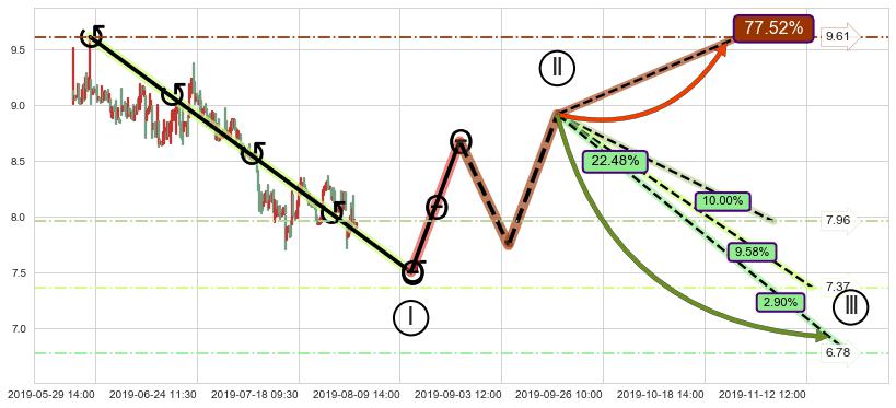 ➢ 循环浪继续向下【最高】位置(11-05:10, 7.96),匹配聚类样本比例44.47%, 可能性概率10.00%