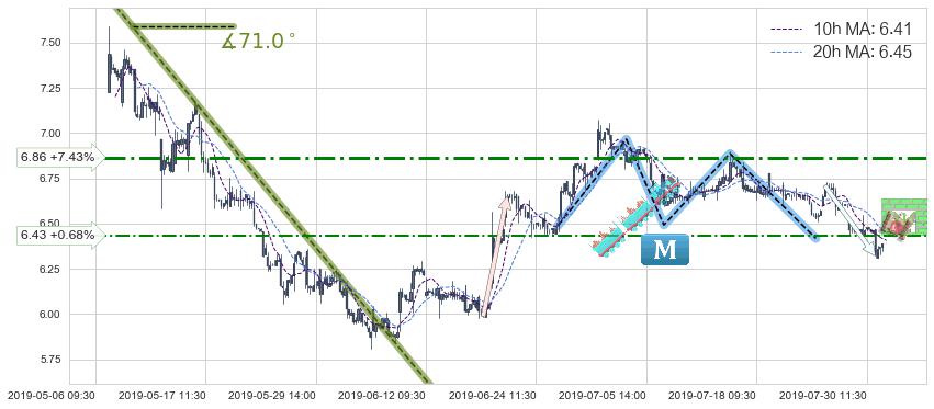 ♘ 阻力价格位6.86,可信任强度56.98%,距离最后交易2019-07-31 15:00形成的收盘价格6.39相差 +7.43%