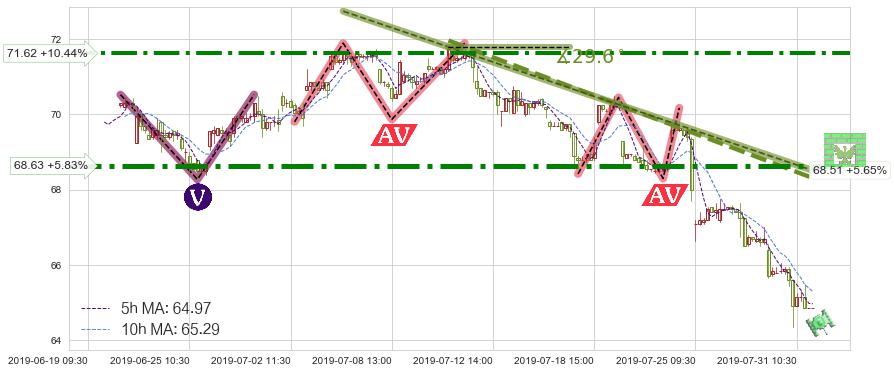 ♘ 在最后的下跌阶段2019-07-04 13:00至2019-07-31 15:00,存在 持续未破位的阻力位 ,阻力价格68.51,可信任强度80.46%,其距离最后价格64.85相差 +5.65%