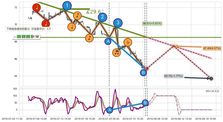 ➣ 预测:2019-08-16 10:00,【继续下探】稳定目前下跌趋势的前提下,预测价格:63.70