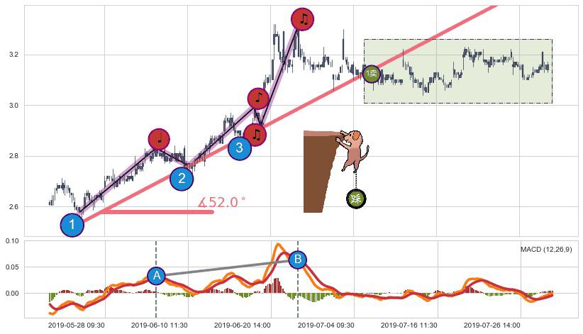 从2019-06-25 11:30至2019-07-31 15:00,共包含154个小时,阶段股价下跌-3.99%,阶段股价变动位移路程比: 1 : 17