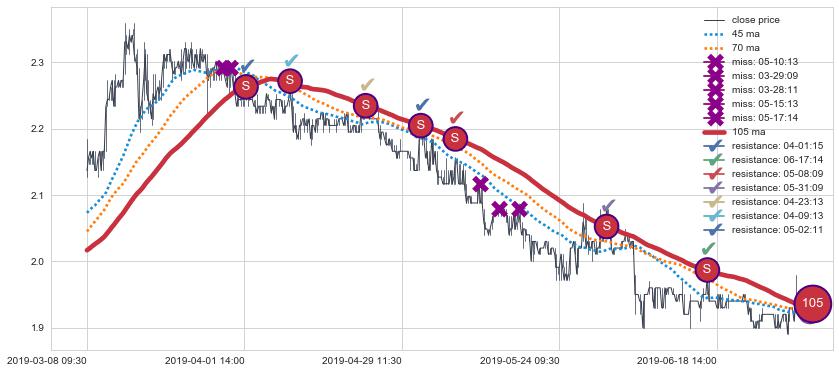 ➢ 最优均线组合共正确确认支撑阻力信号12处,正确确认率 50.00%