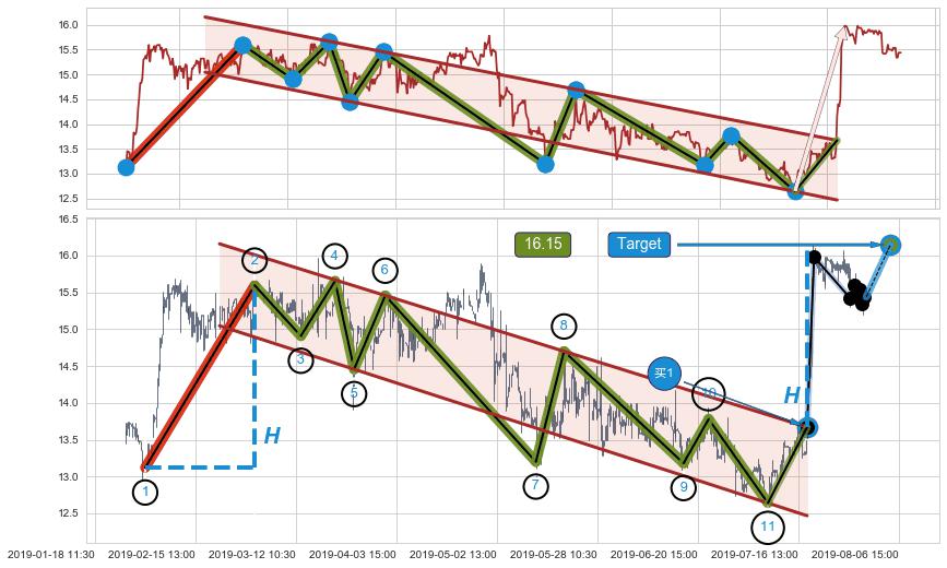 从2019-01-30 14:00至2019-02-13 13:00,共包含39个小时,阶段股价上涨17.03%,阶段股价变动位移路程比: 1 : 1.8