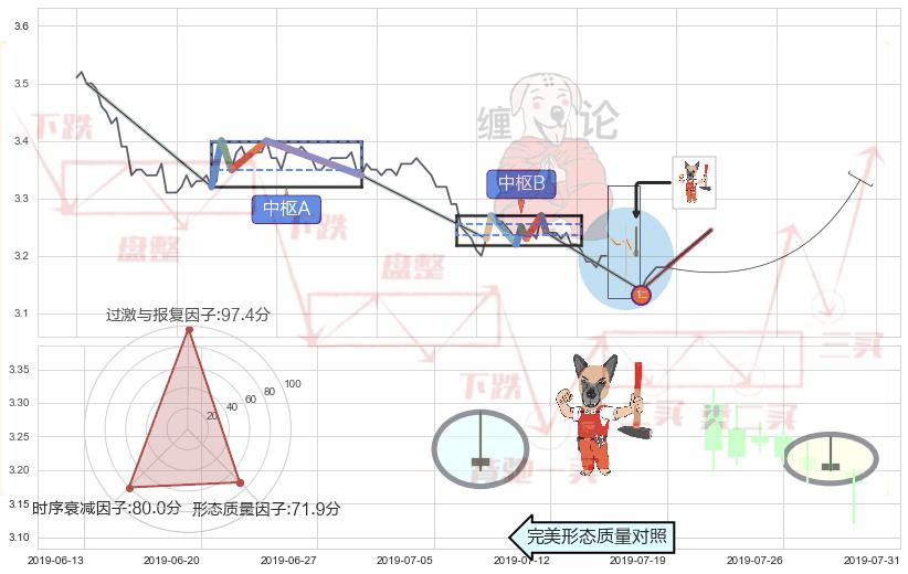 从2019-07-09 10:30至2019-07-31 15:00,共包含101个小时,阶段股价下跌-3.85%,阶段股价变动位移路程比: 1 : 10