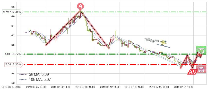 ♘ 阻力价格位5.81,可信任强度84.20%,距离最后交易2019-07-31 15:00形成的收盘价格5.71相差 +1.72%