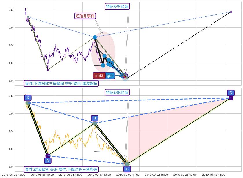 ➢ 下降对称三角整理属【短级别信号事件】谐波鲨鱼属【长级别信号事件】长短周期组合信号事件, 短长事件长度比17.23%