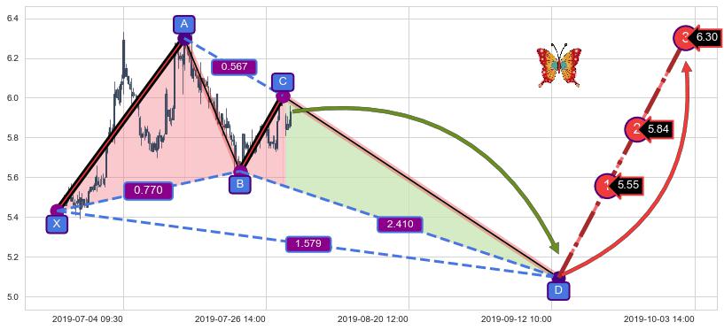 ➣ 未完成【蝴蝶】形态起点X: 06-21:11, 已到达C点: 07-30:14, 预测最终D点: 09-12:15, 共347交易小时