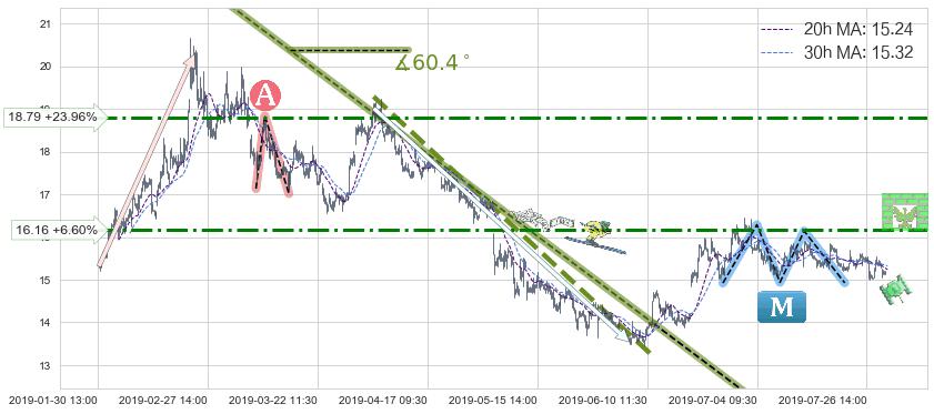 ♘ 阻力价格位16.16,可信任强度67.85%,距离最后交易2019-07-31 15:00形成的收盘价格15.16相差 +6.60%