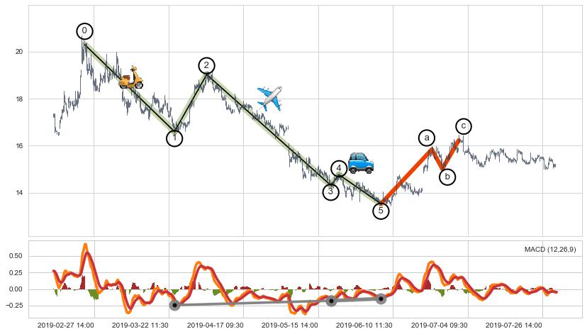 ➣ 波浪理论:猜想达到c点后小反弹终止反转下跌 → 下跌 → 【拐点】临近 → 阶段均值回复结束后继续大周期趋势跟踪