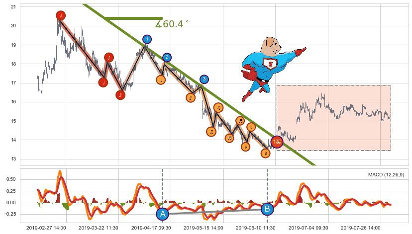 从2019-04-03 15:00至2019-06-11 11:30,共包含256个小时,阶段股价下跌-25.31%,阶段股价变动位移路程比: 1 : 5,下跌趋势角度: 62.7
