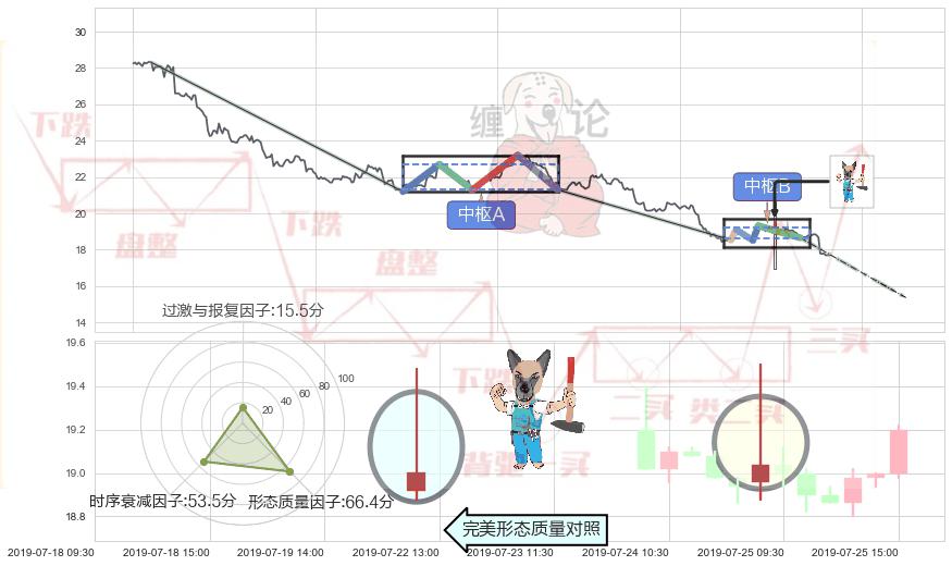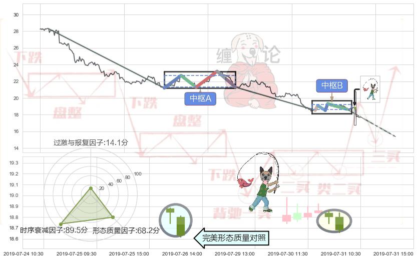 ➢ 【中枢B】:07-18:15-07-29:10,中枢由5笔构成,共39交易小时, ZG=19.10, ZD=18.66