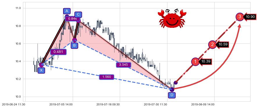 ➢ 谐波螃蟹:c下跌到达d:猜想拉升 → 上涨 →【拐点】强支撑临近 → 大趋势均值回复