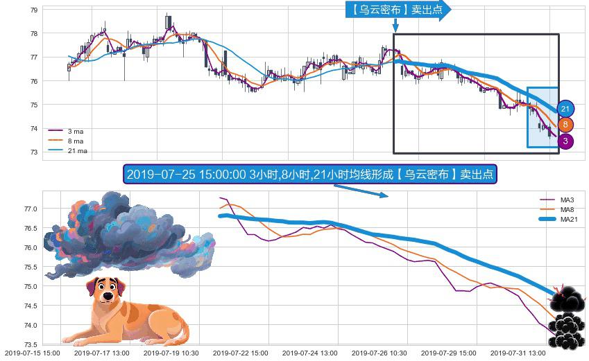 ⚀ 2019-07-19 14:00:00小时-2019-07-31 15:00:00小时显现 3小时-8小时-21小时均线 【乌云密布】卖出点 看空信号,后市看跌,卖出