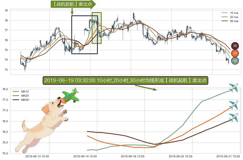 ⚀ 2019-06-14 13:00:00小时-2019-06-21 13:00:00小时显现 10小时-20小时-30小时均线 【战机起航】卖出点 看空信号,后市看跌,卖出