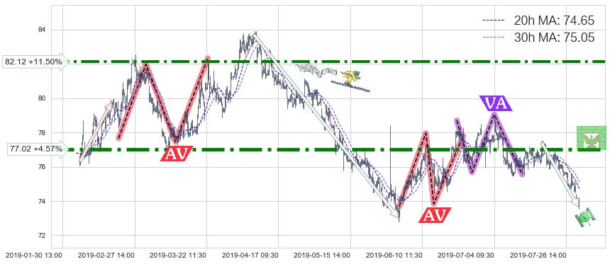 ♘ 阻力价格位77.02,可信任强度87.67%,距离最后交易2019-07-31 15:00形成的收盘价格73.65相差 +4.57%