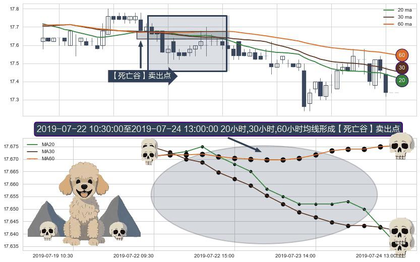 形态多维评估: ⚀ 2019-07-22 11:30:00-小时至2019-07-24 13:00:00-小时显现 20小时-30小时-60小时均线 【死亡谷】卖出点 看空信号,后市看跌,卖出