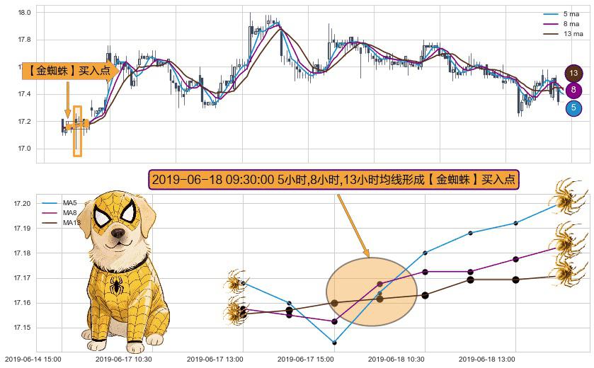 形态多维评估: ⚀ 2019-06-18 09:30:00小时显现 5小时-8小时-13小时均线 【金蜘蛛】买入点 看多信号,后市看涨,买入