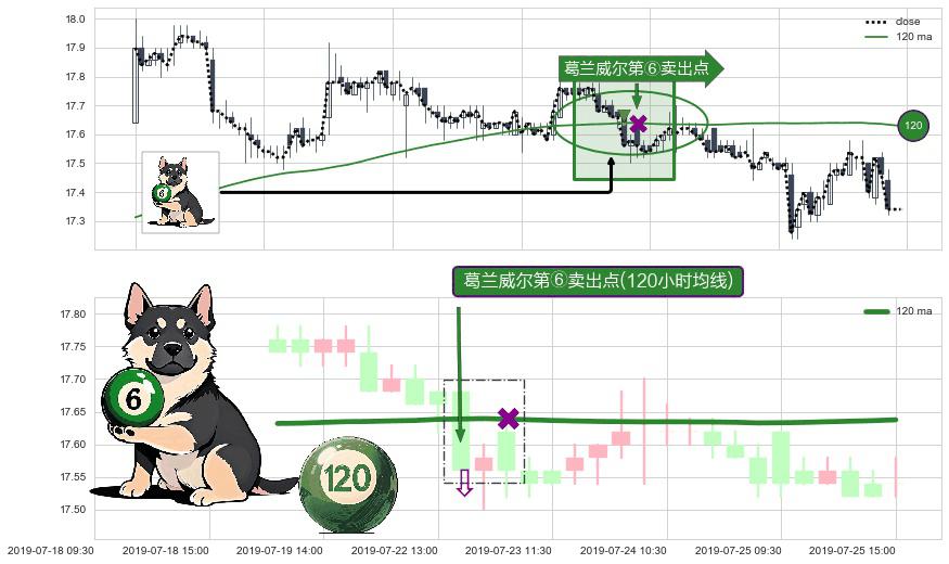 形态多维评估: ⚀ 2019-07-22 14:00:00-小时显现 葛兰威尔均线 120小时均线 第⑥卖出点 走势反转见顶信号,后市看跌,卖出信号