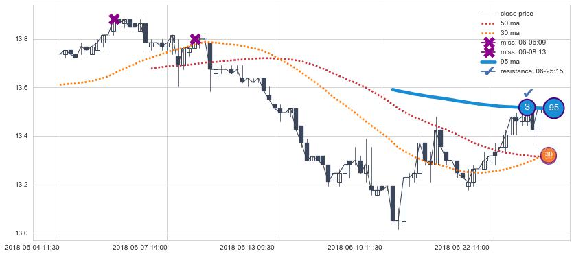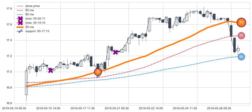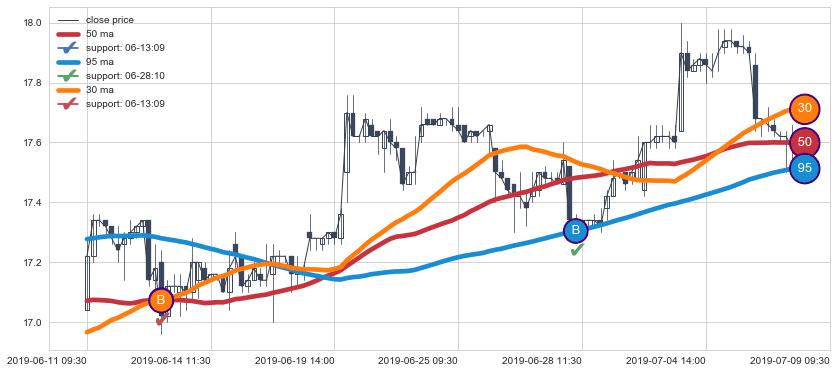 上涨趋势06-11 09:30-07-09 09:30,均线50, 30, 95确认关键支撑2处