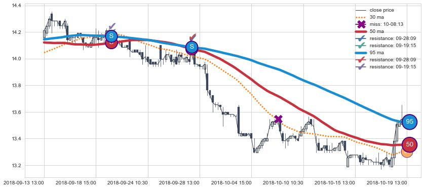 下跌趋势09-13 13:00-10-19 13:00,均线50, 95确认关键阻力2处